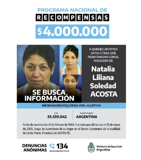 La recompensa para quienes aporten datos útiles o tengan conocimiento del paradero de Natalia Acosta fue establecida en 4 millones de pesos, a lo que se suma la publicación y difusión del retrato de la joven al momento de su desaparición y de la progresión de su imagen generada con un programa de inteligencia artificial, que permite contar con una foto actualizada de la mujer.