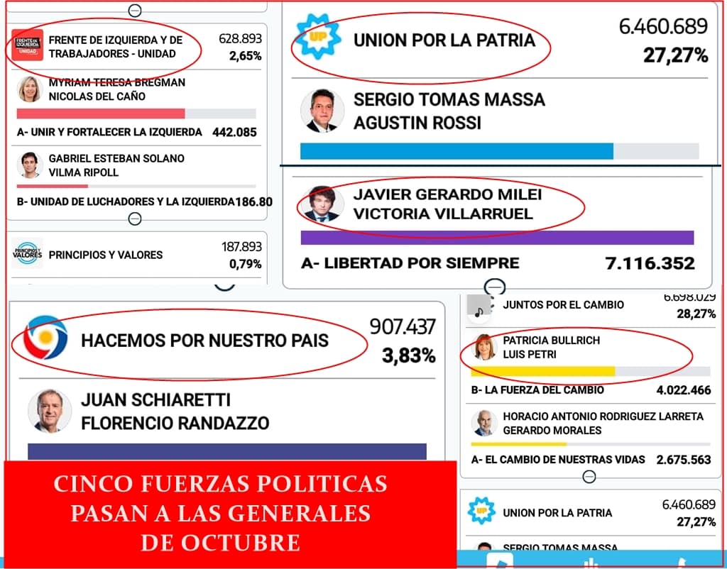 De acuerdo a los datos provisorios, sólo lograron la aprobación de los ciudadanos en estas PASO 2023 y el pase a las elecciones de octubre La Libertad Avanza (30,04%); Juntos por el Cambio (28,27%), Unión por la Patria (27,27%); Hacemos (3,83%) y el Frente de Izquierda y de los Trabajadores (2,65%).