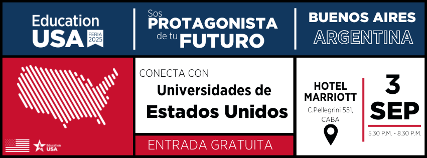 EducationUSA , con el apoyo del Departamento de Estado y la Embajada de los Estados Unidos, invita a estudiantes de secundaria, universitarios y profesionales a la Feria EducationUSA 2025 en la Ciudad de Buenos Aires. Tras el éxito de su edición anterior, este evento gratuito vuelve a reunir a prestigiosas universidades de Estados Unidos, que compartirán sus propuestas académicas y toda la información necesaria sobre el proceso de postulación a carreras de grado, posgrado, cursos cortos y cursos de inglés.